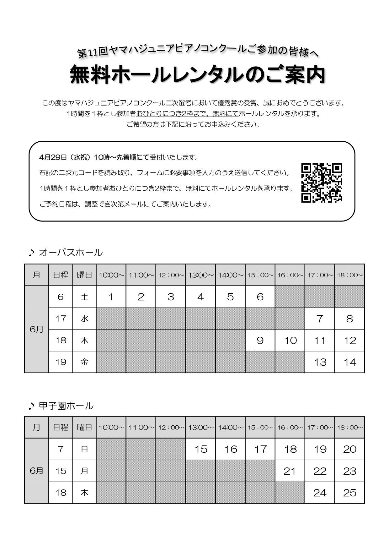 YJPCホールレンタル 2026年4月17日 最終更新日時 : 2026年4月17日 opus-otc 参加申込2026年4月29日より受付開始します。 前の記事第11回ヤマハジュニアピアノコンクール(映像審査)2026年1月24日