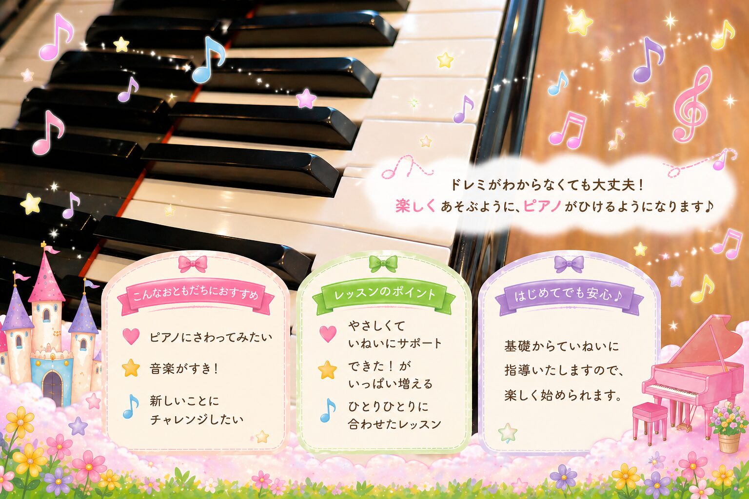 幼児から大人の方、保育士志望、音大受験の為の聴音・楽典・ソルフェージュ指導まで、ピアノを楽しみたい方から本格的なレッスンまで多くのピアノ教室をご紹介します。
