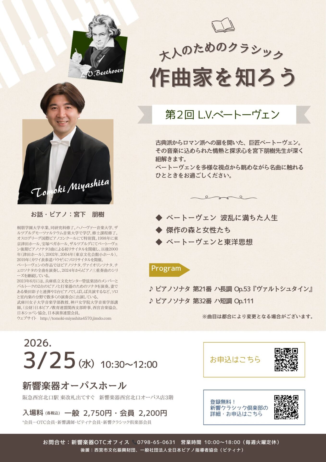 | 入場料 | 一般 2,750円・会員 2,200円(税込) *会員…OTC会員・新響講師・ピティナ会員・新響クラシック倶楽部会員