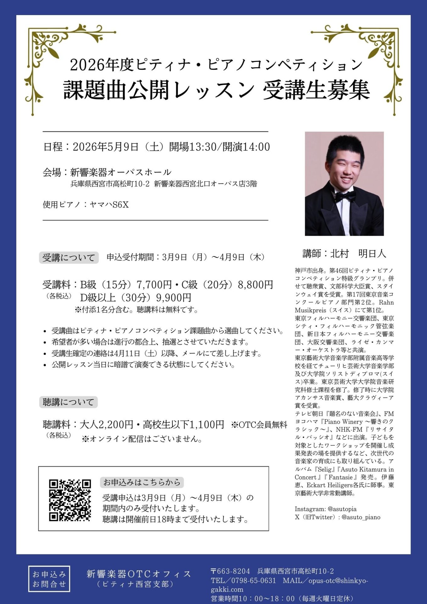 受講生確定の連絡は4月11日(土)以降、メールにてご連絡差し上げます。 - 公開レッスン当日に暗譜で演奏ができるようご準備ください。