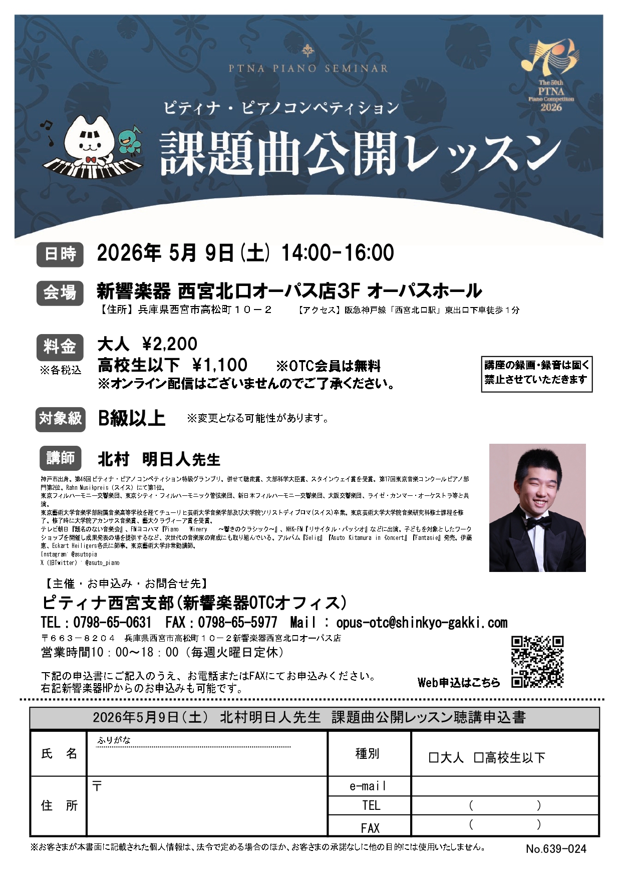 | 会場 | 新響楽器 西宮北口オーパス店 3Fオーパスホール 〒663−8204 兵庫県西宮市高松町10−2 |