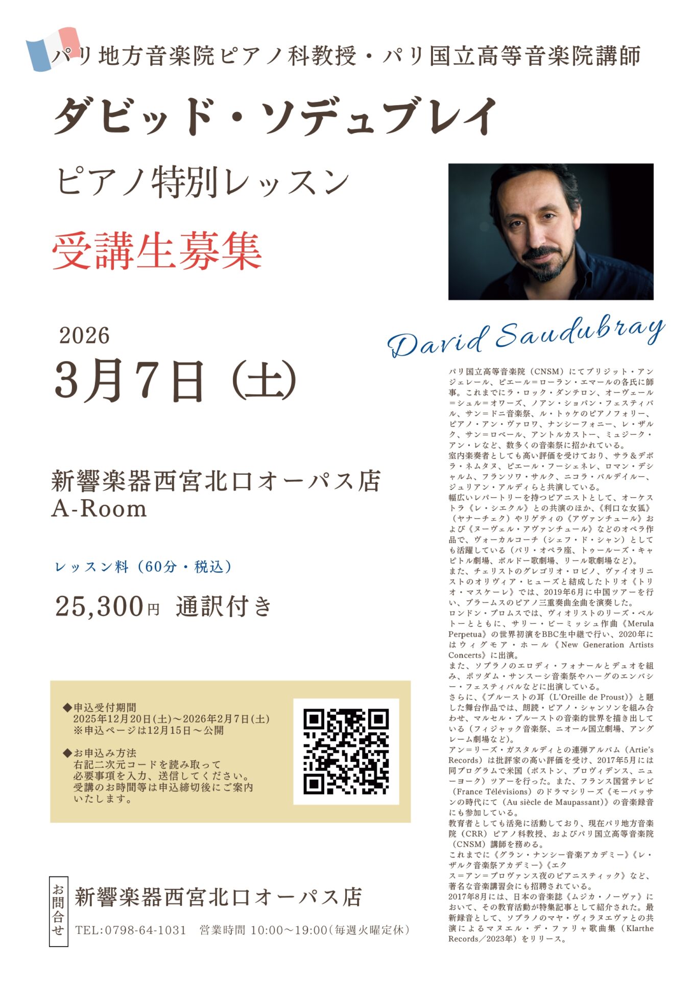 【受講生募集】ダビッド・ソデュブレイ先生 ピアノ特別レッスン