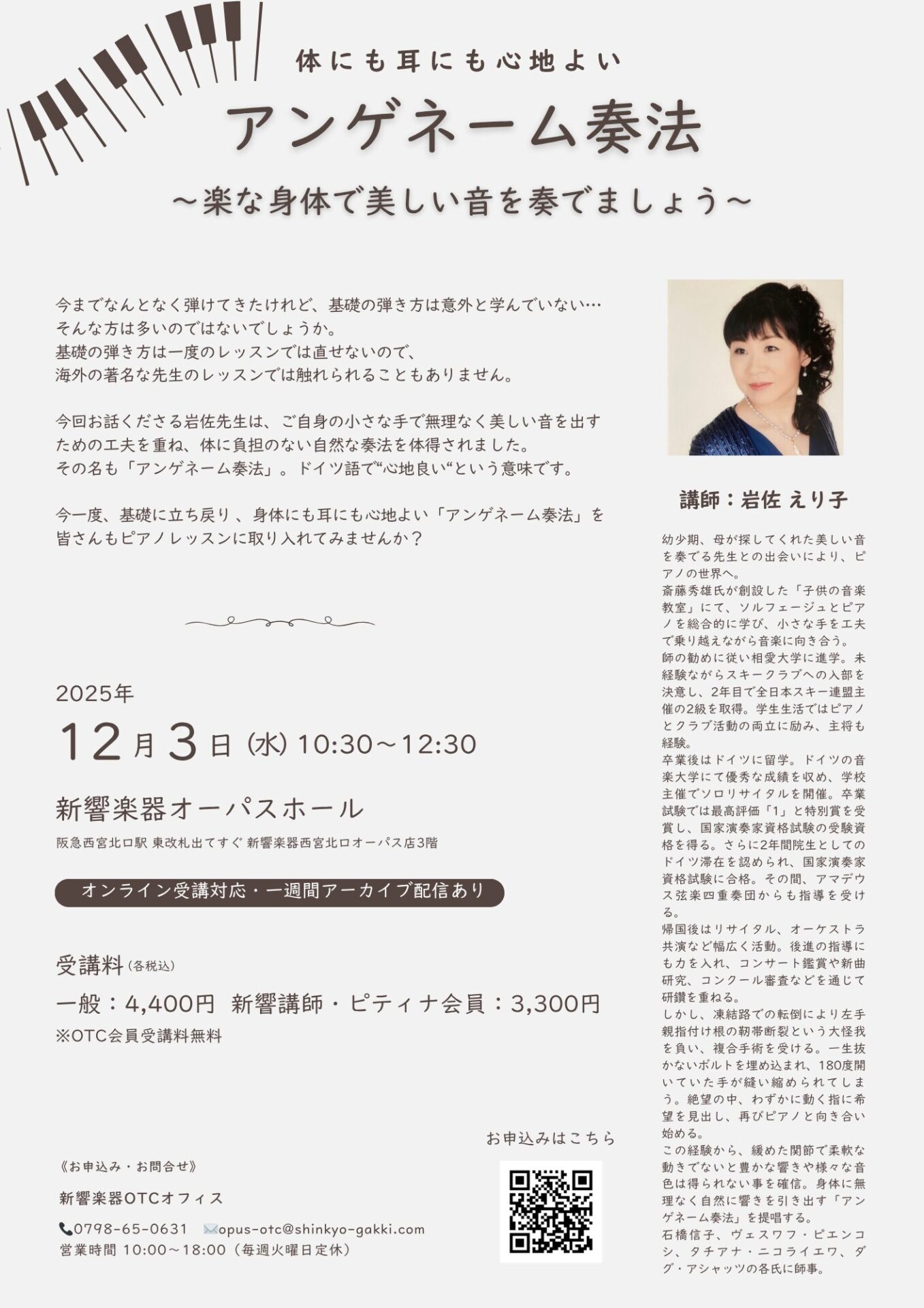 | 日 程:2025年12月3日(水)10:30~12:30 会 場:新響楽器西宮北口オーパス店 3階 オーパスホール 入場料:一般¥4,400 ピティナ会員・新響講師¥3,300 OTC会員無料 ※オンライン受講(一週間アーカイブ配信付き)あり |