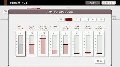 タッチトーン、ピッチに加え、カットオフ周波数、レゾナンス、LFOパラメータをアフタータッチによってコントロールすることが可能。