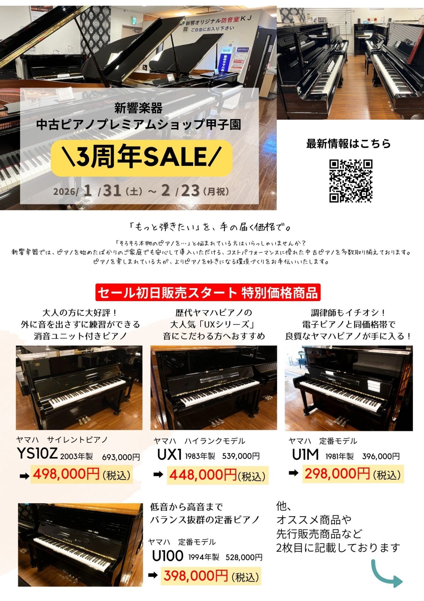 中古ピアノプレミアムショップ甲子園では、リニューアル3周年を記念したセールを開催致します!