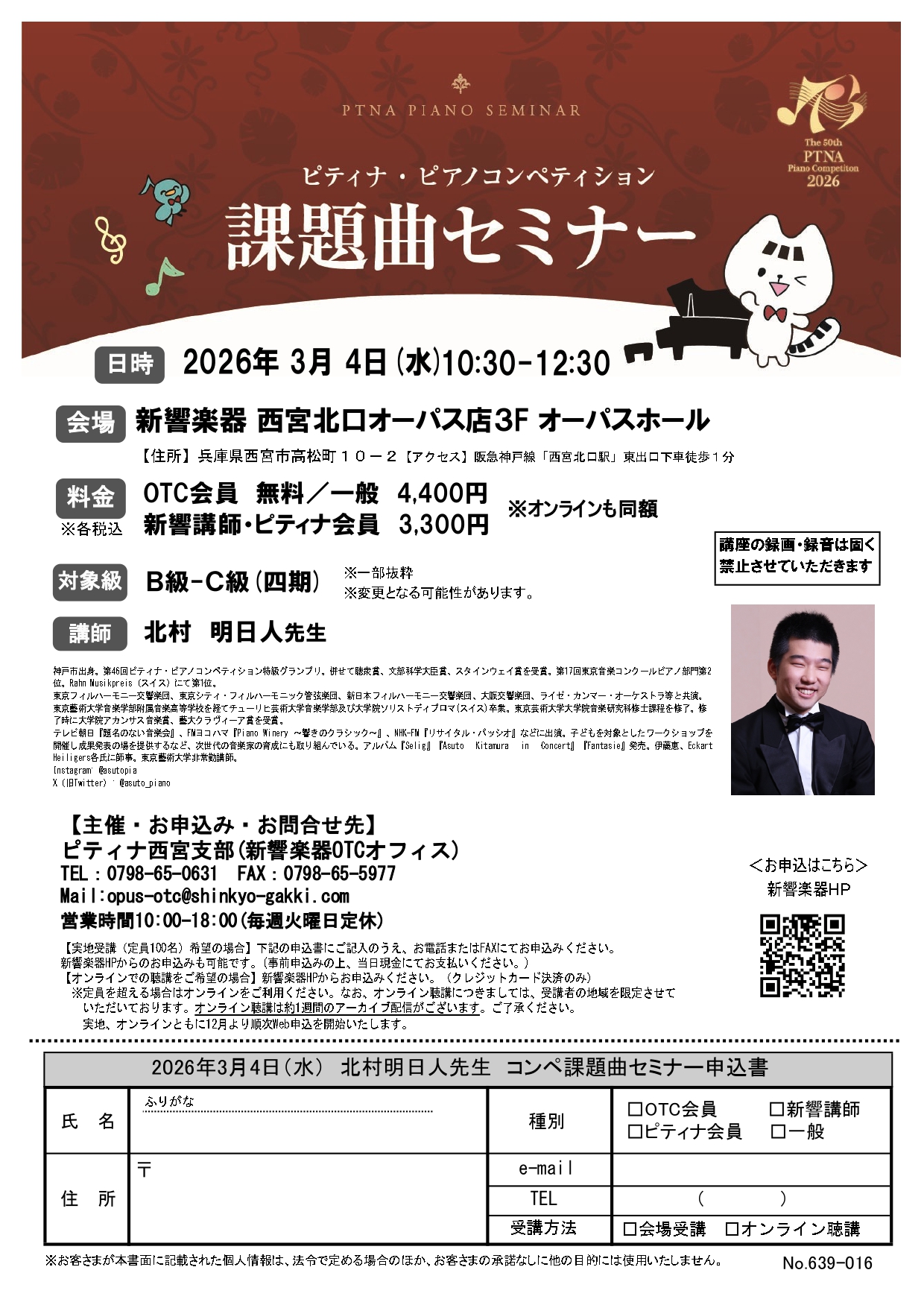 | 日 程:2026年3月4日(水)10:30~12:30 会 場:新響楽器西宮北口オーパス店 3階 オーパスホール 入場料:一般¥4,400 ピティナ会員・新響講師¥3,300 OTC会員無料 ※オンライン受講(一週間アーカイブ配信付き)あり |