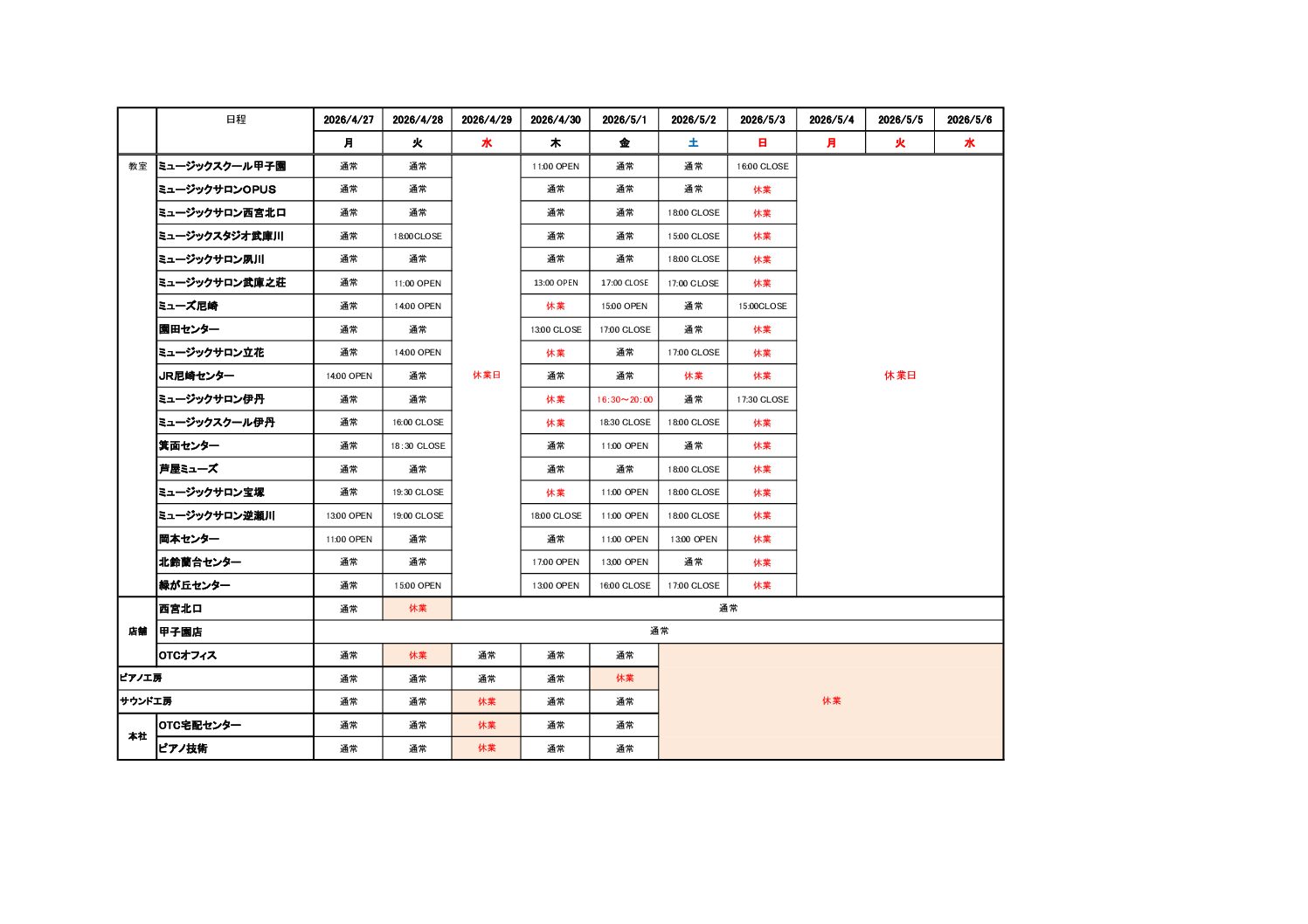 ゴールデンウィーク期間 営業日について 2026年4月24日 最終更新日時 : 2026年4月24日 寺岡 西宮北口OPUS店 4月27日(月) 通常営業 4月28日(火) 定休日 5月29日(水) 〜 5月6日(水) 通常営業 甲子園店 4月27日(月)より 5月6日(水) 通常営業 各教室会場・各部門の休業営業時間はこちらをご覧ください。