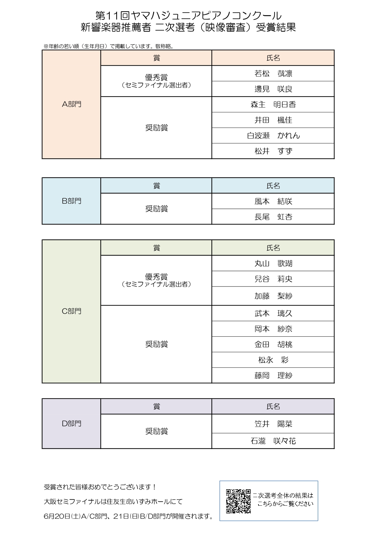 第11回ヤマハジュニアピアノコンクール 映像審査結果